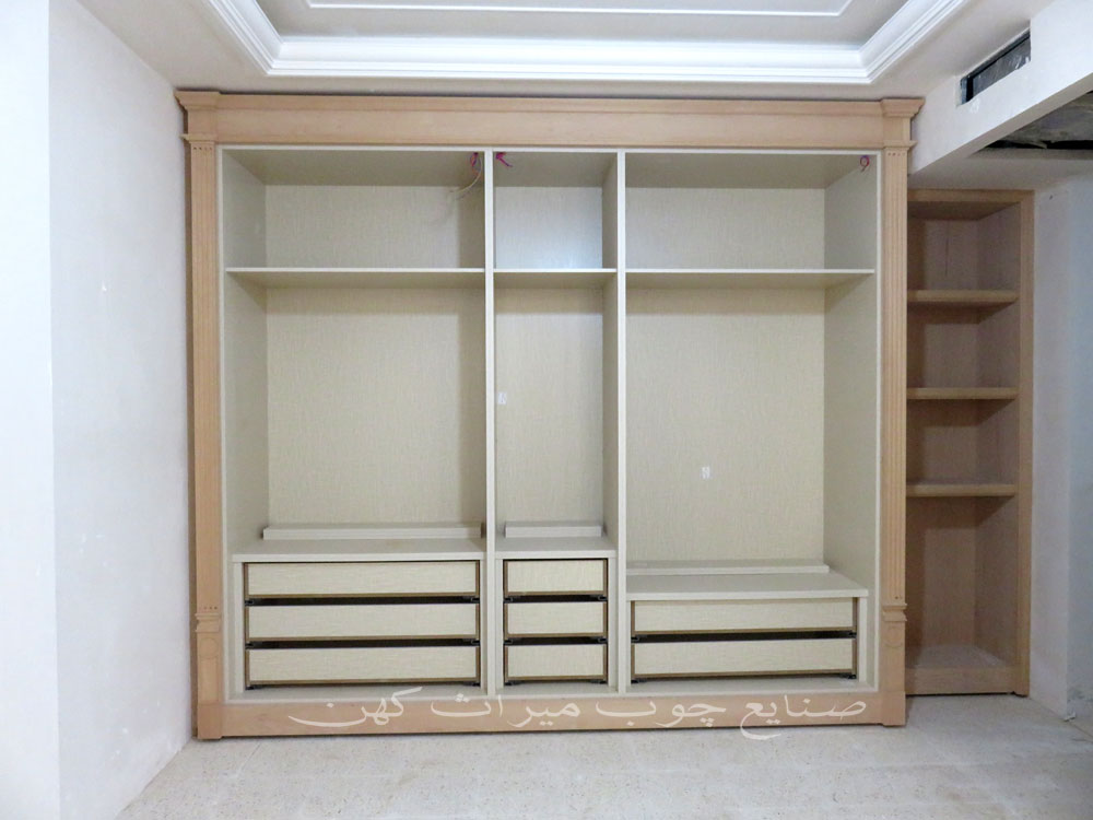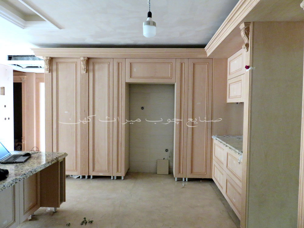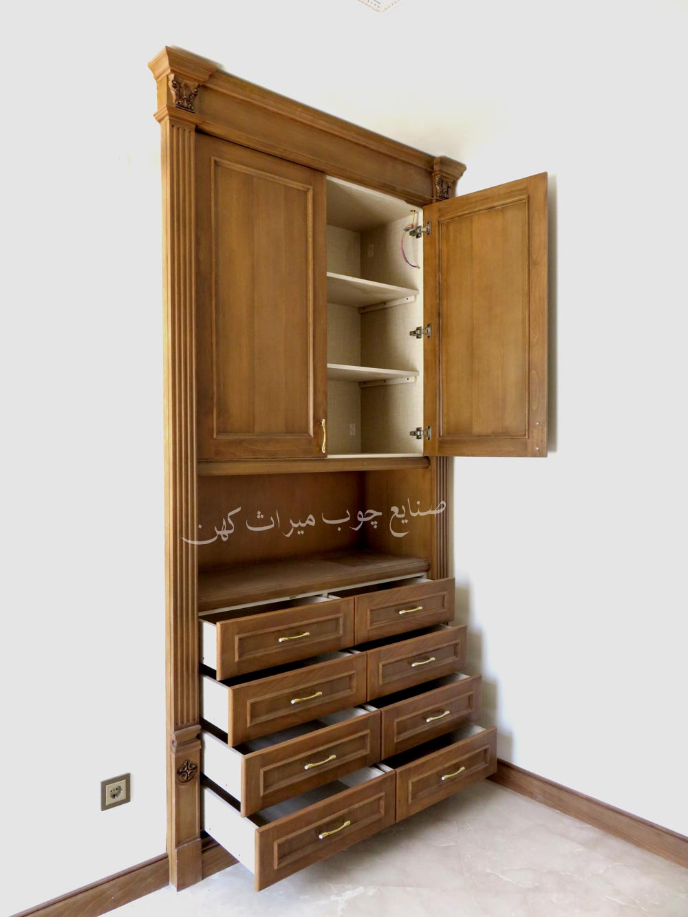 کمد و کابینت تاج دار به سبک اروپایی همراه با منبت که از جنس چوب راش آلمانی هستند و داخل و ورقه های پشت آنها از جنس mdf شانزده میلیمتری با روکش کتان استفاده شده است.